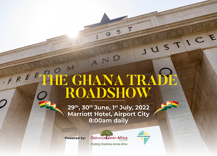 AfreximBank and Oakwood Green Africa in conjunction with Ghana Export Promotion Authority, Ghana Free Zones Authority, AfCFTA Secretariat, GCB and CBG is organizing a three (3) day Ghana Trade Road Show on Wednesday June 29, Thursday June 30 and Friday July 1, 2022 for Banks and Non-Bank Financial Institutions as well as the Business community in Ghana. This maiden event is under the theme: “Supporting the Africa Trade Agenda- Ensuring the Last Mile”.